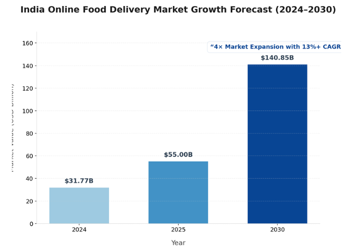 India’s online food delivery revenue is projected to reach about USD 55 billion in 2025, and the market is expected to grow at a CAGR of over 13% through 2030. The online ordering and delivery segment in India is forecasted to grow from USD 31.77 billion in 2024 to about USD 140.85 billion by 2030, showing exceptional long term expansion.