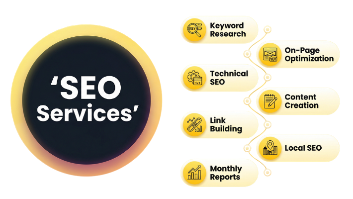 SEO services are typically offered in packages that comprise keyword research, content writing, link building, local SEO, on-page SEO, technical SEO, and creation of performance reports on a monthly basis.